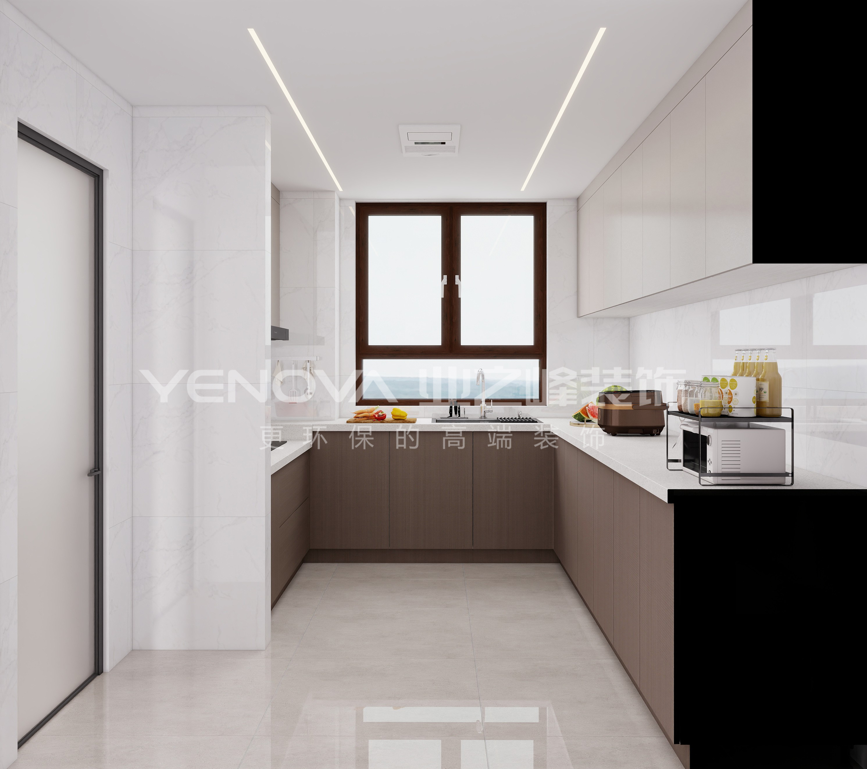 厨房整体色调沉稳大气,橱柜采用深咖色,搭配白色墙面与米色地面,形成鲜明对比,尽显简洁利落。厨房设备齐全,黑色燃气灶与白色吊柜相得益彰,功能与美观兼具。